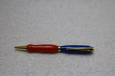 Slimline Acrylic Pen. Uses Cross refill. Straight brass pocket clip. Colors will vary from picture.